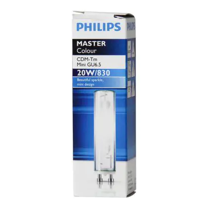 Le Philips CDM-Tm Mini 20W 830 GU6.5 (MASTERColour) sono lampade a scarica compatte ad alogenuri metallici estremamente efficienti che presentano una potenza di 20W e sono dotate di attacco del tipo GU6.5. Queste lampade a scarica compatte hanno una vita media di 15.000 ore e producono una luce bianca brillante. La resa dei colori delle Philips CDM-Tm Mini 20W 830 GU6.5 (MASTERColour) é molto buona grazie all'indice di resa cromatica di 80-89Ra: questo sta ad indicare che le caratteristiche degli oggetti illuminati sono poste in risalto in maniera ottimale.